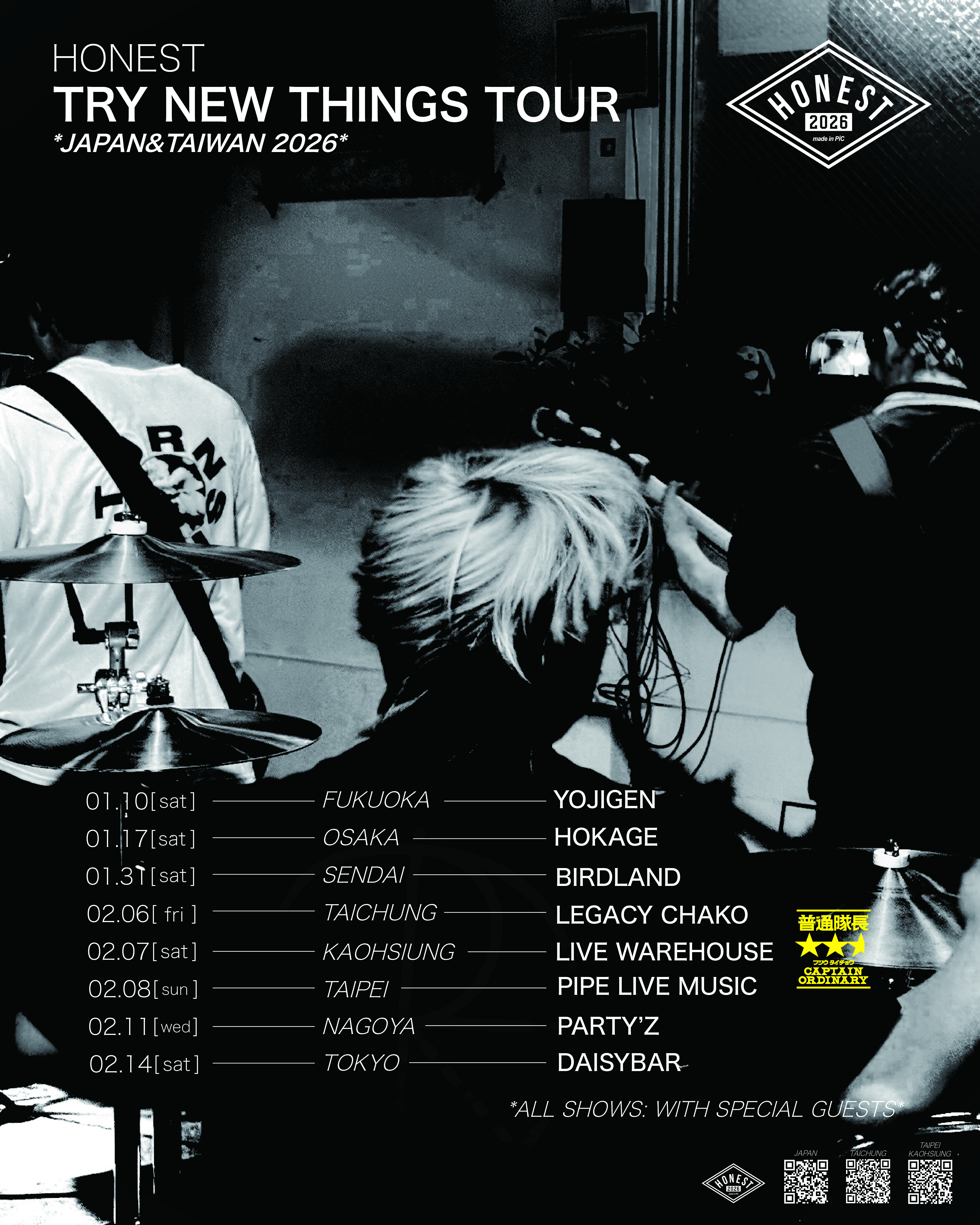 LIVE SCHEDULE 2026.01.10(土) 福岡四次元 HONEST > ACT HONEST / All I Clacks > OPEN17:00 > START18:00 > ADV ¥3000 > DOOR ¥3500 +1D TOP